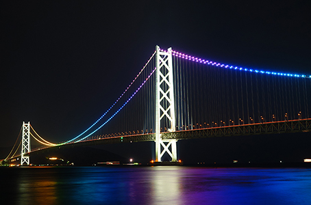 夜の海に浮かび上がる幻想的な景色は、やさしい光に照らされた壮大な橋が闇に映え、昼間とはまったく違う美しさを楽しめます。季節やイベントごとに表情を変える光景は、思わず見とれてしまう感動のひとときです。